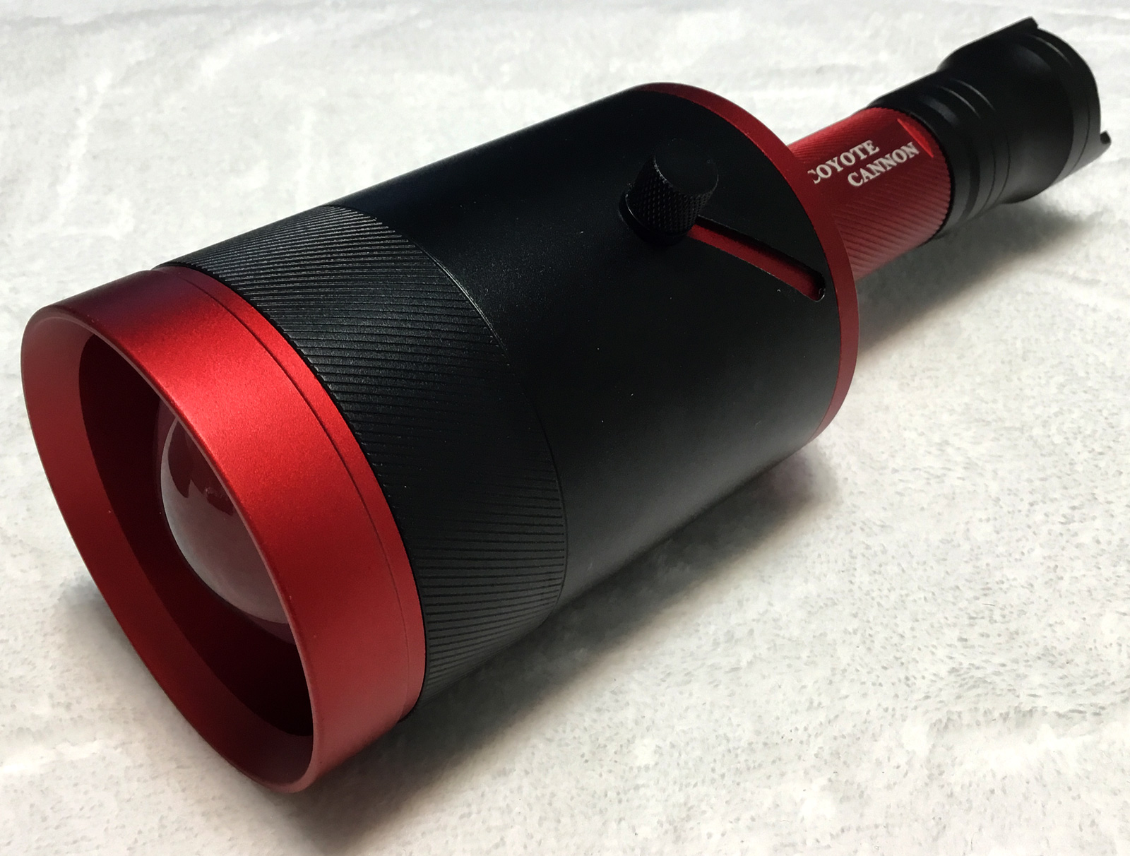 Coyote Cannon has an Adjustable focus so you can go from a flood beam to spot beam allowing you to put just the right amount of light on your target. It only takes about 1/8 turn of the head to go from full flood to full spot beam. You can also lock down the focus. This means if you want to lock down the focus of the beam at full flood, full spot beam or anywhere in between you can.